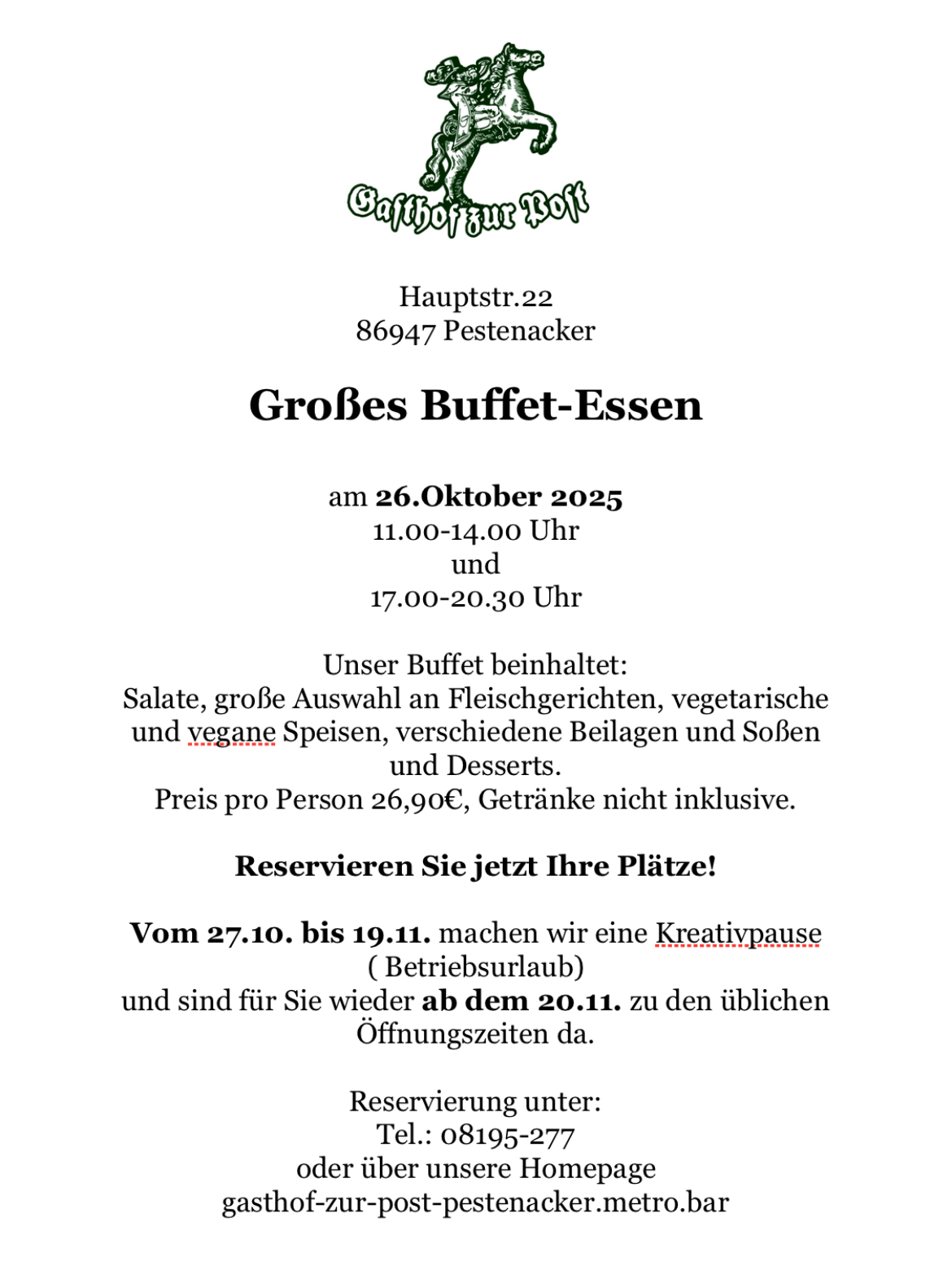 Willkommen im Gasthof Zur Post Pestenacker bei Weil. Wir freuen uns, Sie begrüßen zu dürfen. Unser Gasthof ist der perfekte Ort, um ein paar Stunden zu genießen. Wir bieten Ihnen nicht nur köstliche Gerichte der deutschen Küche, aber auch international inspirierte Speisen an. Bringen Sie Ihre Freunde und Familie mit und genießen Sie unser köstliches Essen. Wir können auf eine Vielzahl von Ernährungswünschen eingehen und bieten eine Auswahl an glutenfreien, laktosefreien, veganen und vegetarischen Optionen. Erfrischendes Bier, Wein, alkoholfreie Getränke ,Kaffee und Tee stehen ebenfalls für Sie bereit. Genießen Sie Ihre Zeit in unserem Lokal, welches auf eine über 400 Jahre alte Geschichte zurückblicken kann. Im Sommer können Sie sich in unserem gemütlichen Biergarten verwöhnen lassen .